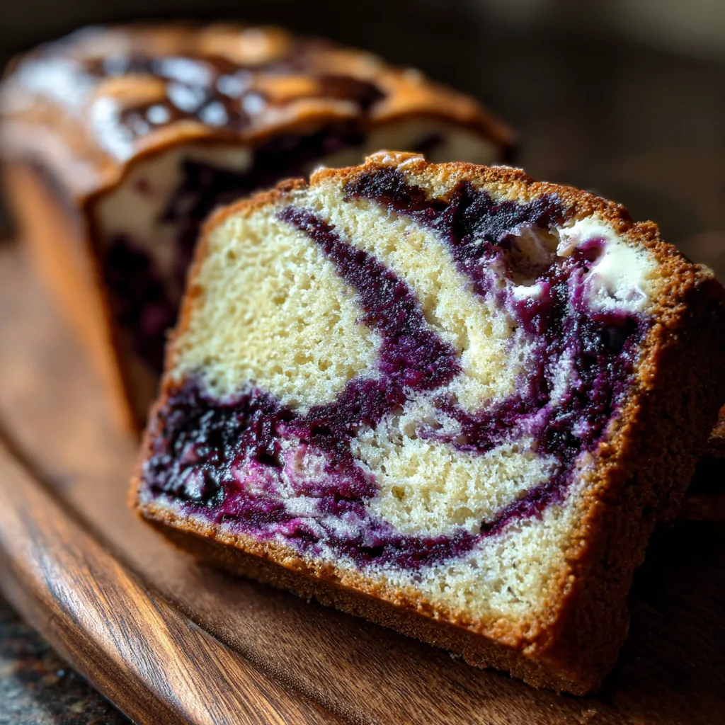 A rich and moist pound cake swirled with sweet cream cheese filling and juicy blueberries, perfect for dessert or coffee time.