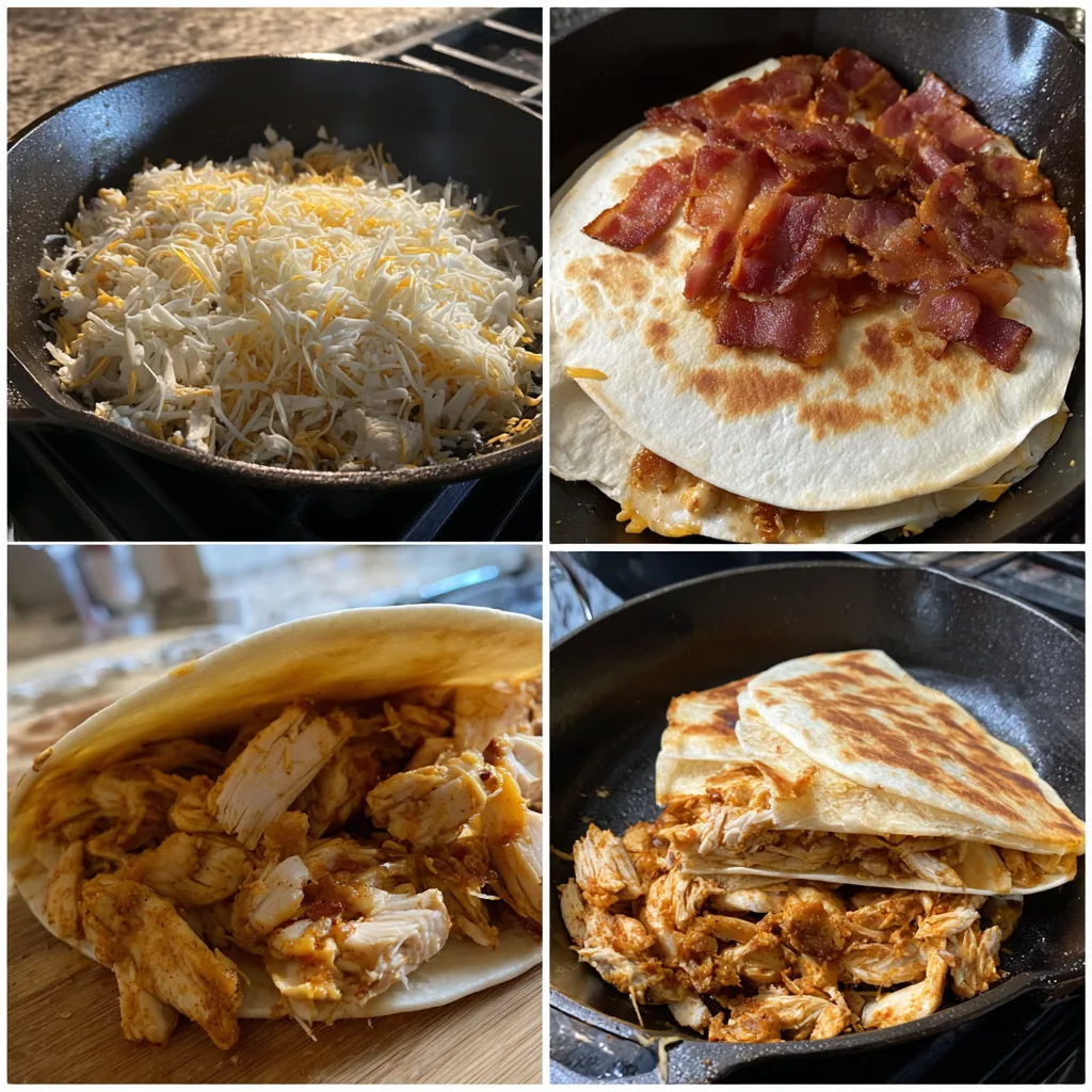 Crispy and cheesy quesadillas filled with tender chicken, smoky beef bacon, and melted cheese, perfect for a quick and satisfying meal.