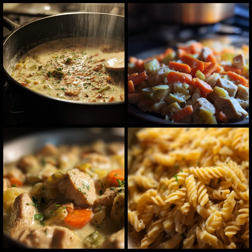 A comforting creamy chicken pot pie pasta combining tender chicken, vegetables, and pasta in a rich, velvety sauce inspired by classic pot pie flavors.