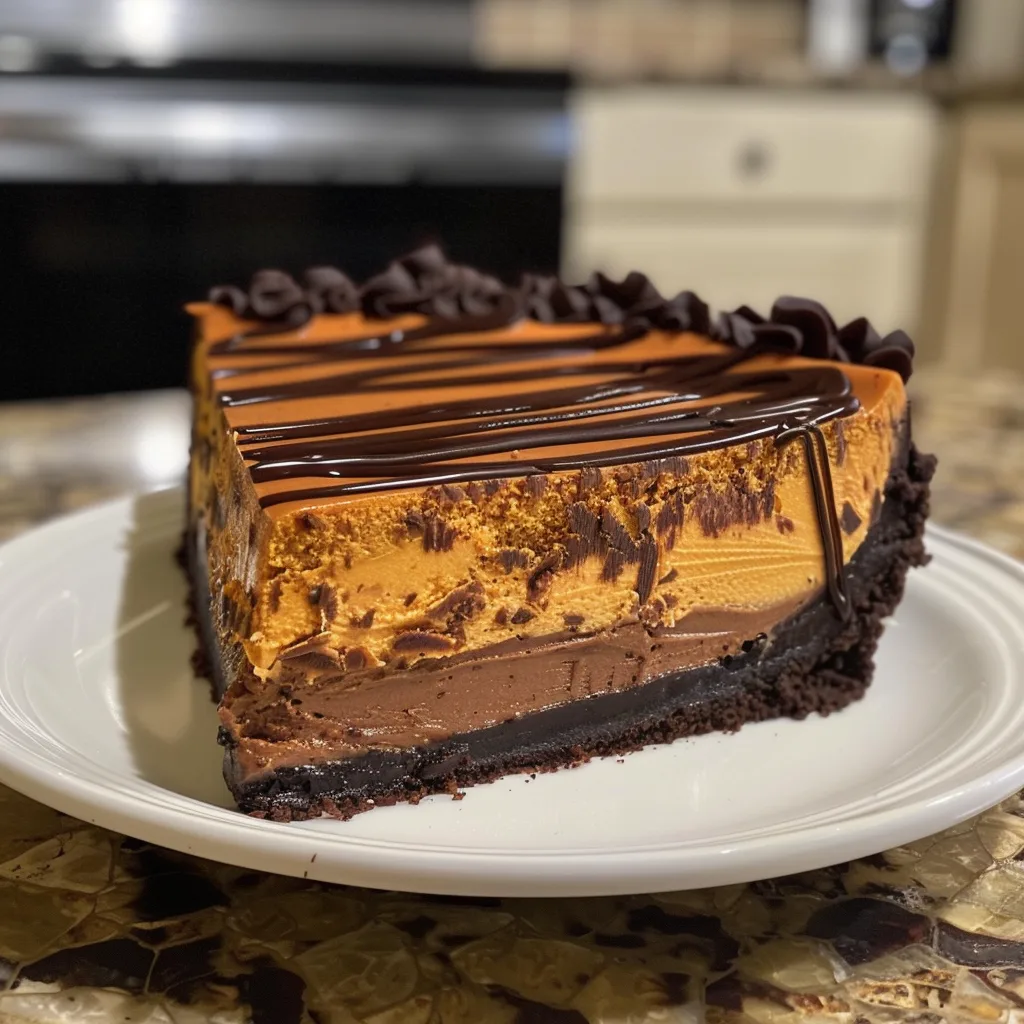 A rich and indulgent dessert featuring a fudgy brownie base topped with a smooth, spiced pumpkin cheesecake layer, perfect for fall gatherings and holidays.