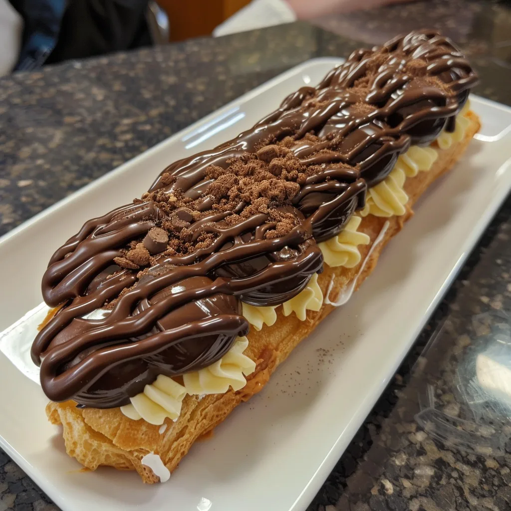 A decadent no-bake dessert inspired by classic chocolate éclairs, made with layers of cookies, creamy vanilla filling, and a rich chocolate topping.