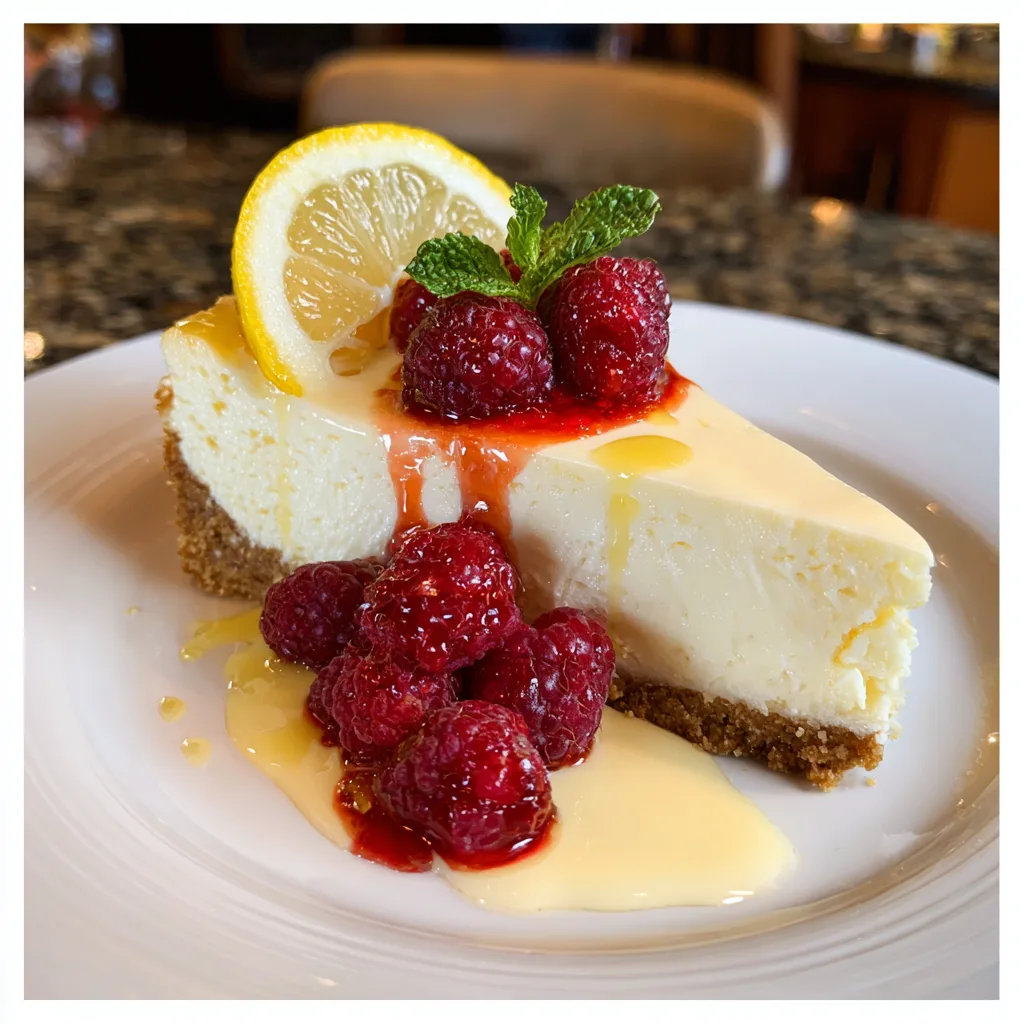 A rich and creamy lemon cheesecake with a buttery graham cracker crust and a bright citrus flavor, perfect for special occasions or an indulgent dessert.