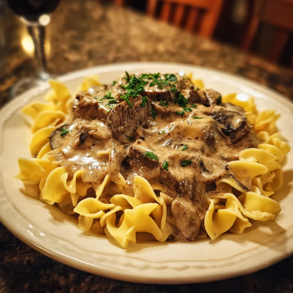 Slow-Cooker Beef Stroganoff is highly adaptable. For a lighter version, use Greek yogurt in place of sour cream, adding it off the heat to prevent curdling. Chicken or turkey can be substituted for beef, reducing cooking time slightly. For extra richness, stir in a small amount of cream cheese along with the sour cream. Adding thyme or parsley introduces a fresh herbal note. If you prefer a thicker sauce, a cornstarch slurry can be stirred in during the final 30 minutes of cooking. For a low-carb option, serve the stroganoff over mashed cauliflower or zucchini noodles instead of egg noodles.