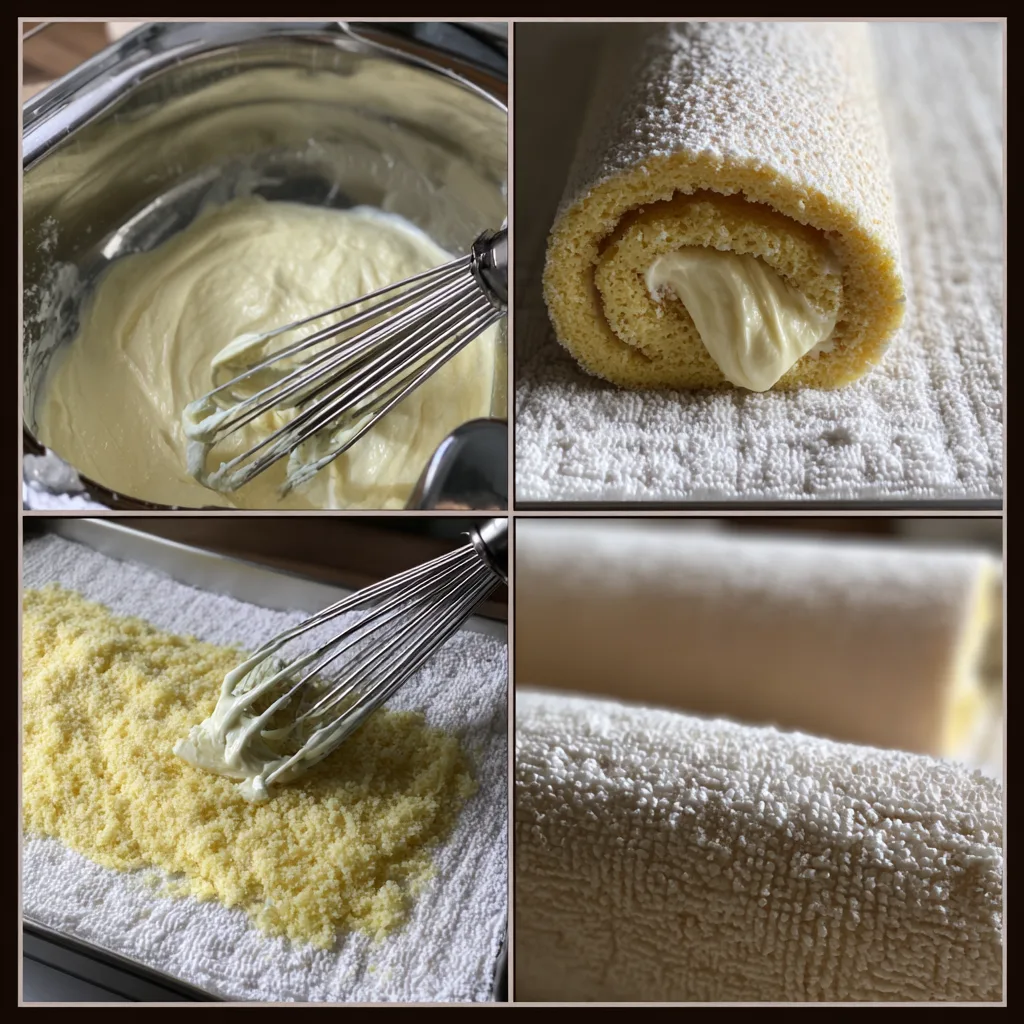 10. Unroll cake gently, spread cream evenly, then re-roll without the towel.