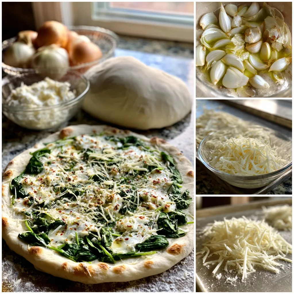 There is something undeniably elegant about a white pizza. Without the traditional tomato sauce, every ingredient has the opportunity to shine in its own right. This white pizza topped with roasted garlic, fresh spinach, and a rich blend of cheeses is a perfect example of how simplicity can create extraordinary flavor. The creamy base, sweet roasted garlic, and vibrant spinach combine into a balanced, satisfying dish that feels both comforting and refined.
